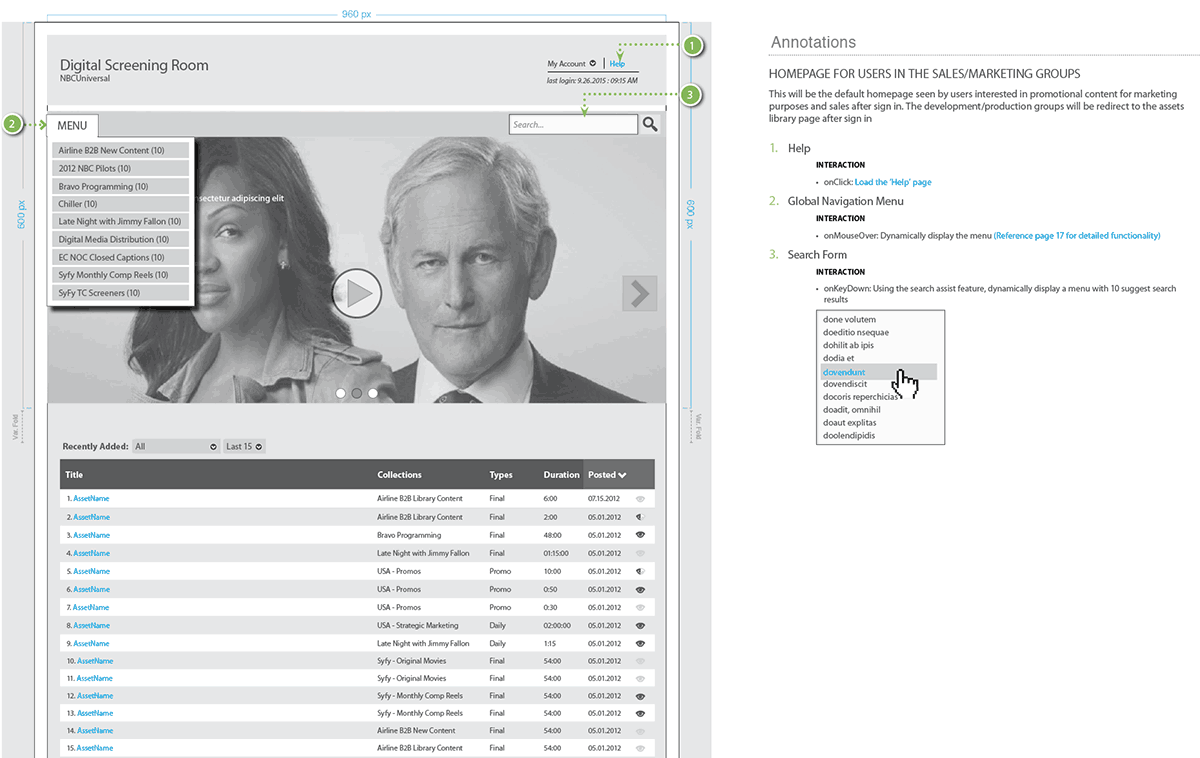 Working with a very limited budget, under time sensitive constraints, and an antiquated back-end in need of upgrading, the requirement was the redesign and modernization of an internal tool for previewing upcoming TV shows, and new episodes or running shows. NBC partners and authorized merchants would then select the programs they wish to order and air on Airline Non-Theatrical, Global Networks, International Studios, NBC Network, The Late Night Shows and UPHE Acquisitions