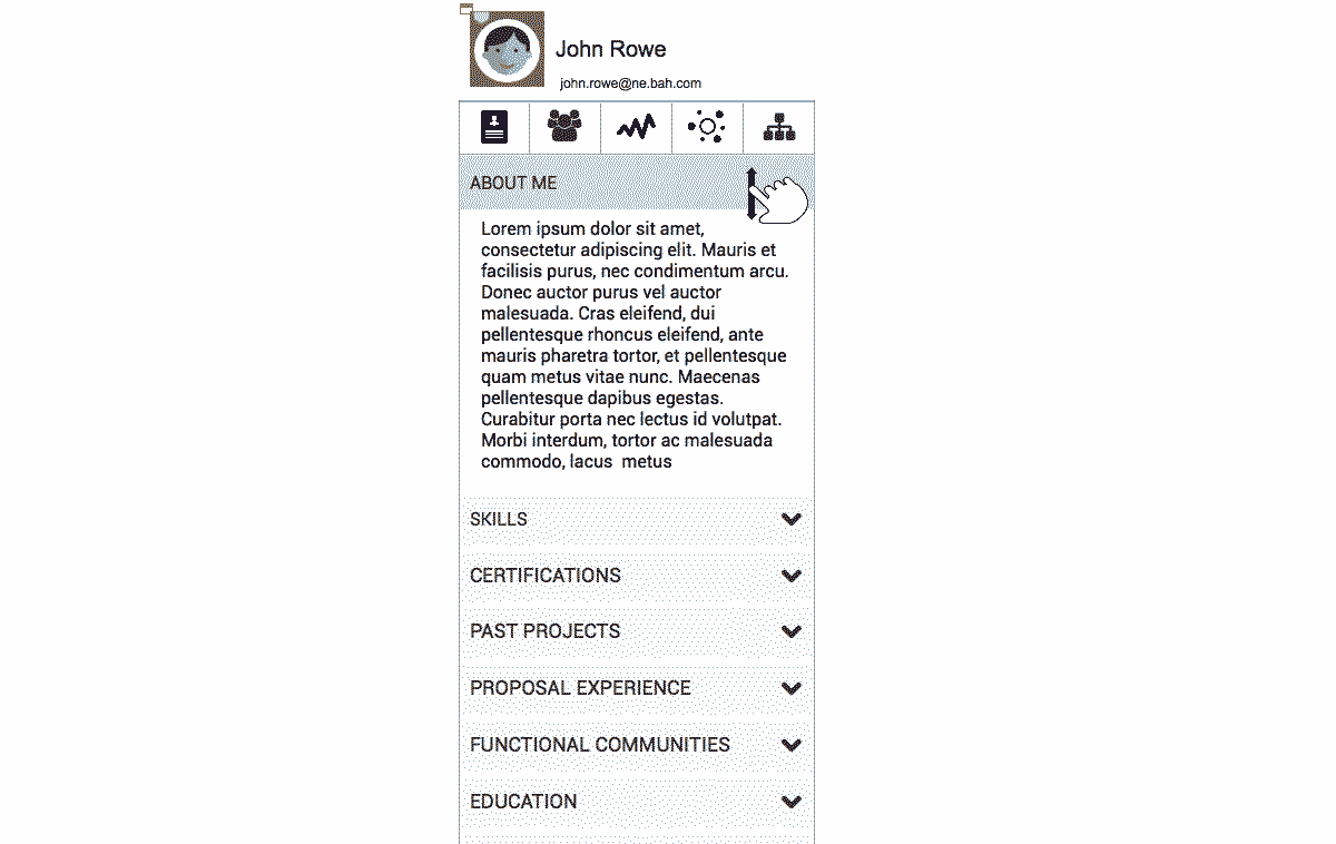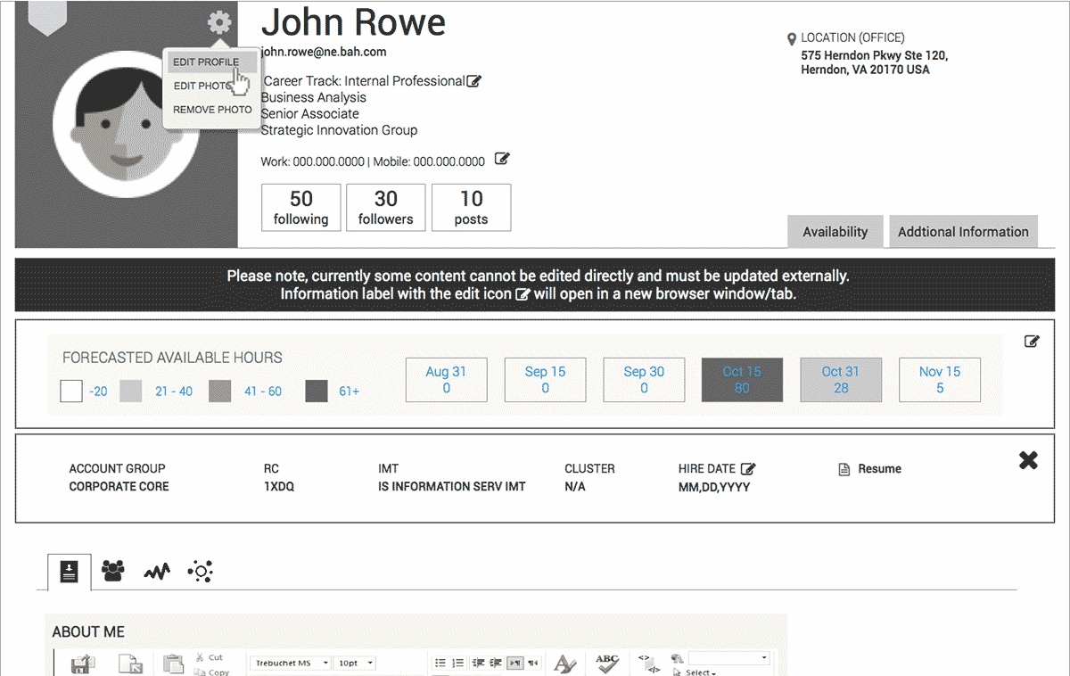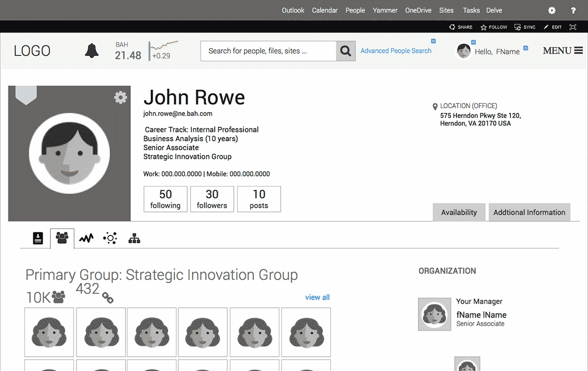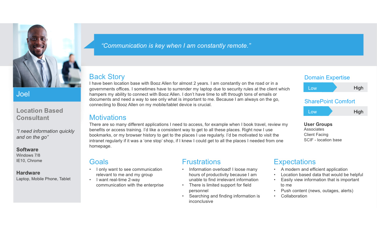 The engagement from Booz Allen Hamilton (BAH) was to envision and build a SharePoint Intranet to replace their existing platform, which did not promote a rich and complete user experience. The issues spanned a target audience of over 23,000 employees across 12 countries. The nine user types that segmented the workers changed continuously within a fluid organizational structure. My team’s distinctive challenges were