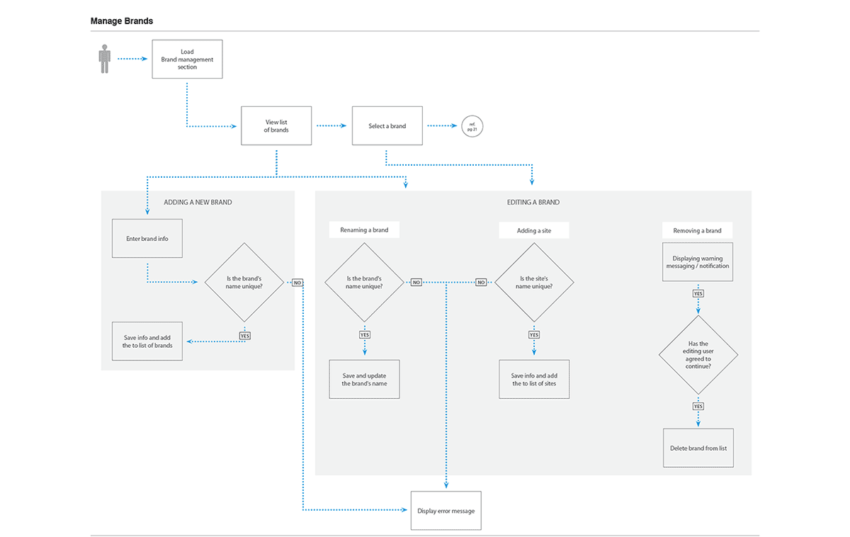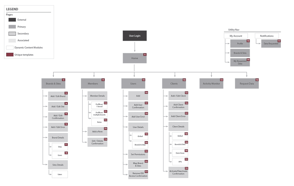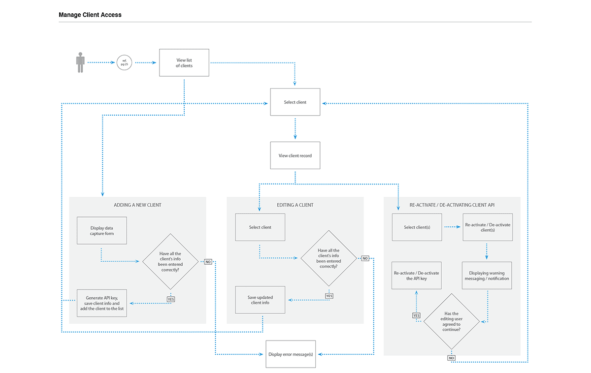 Flow diagrams were prepared to communicate the logic of each actor within the system. The completion of these user/data flow diagrams paved the way for the data taxonomy and interface design.