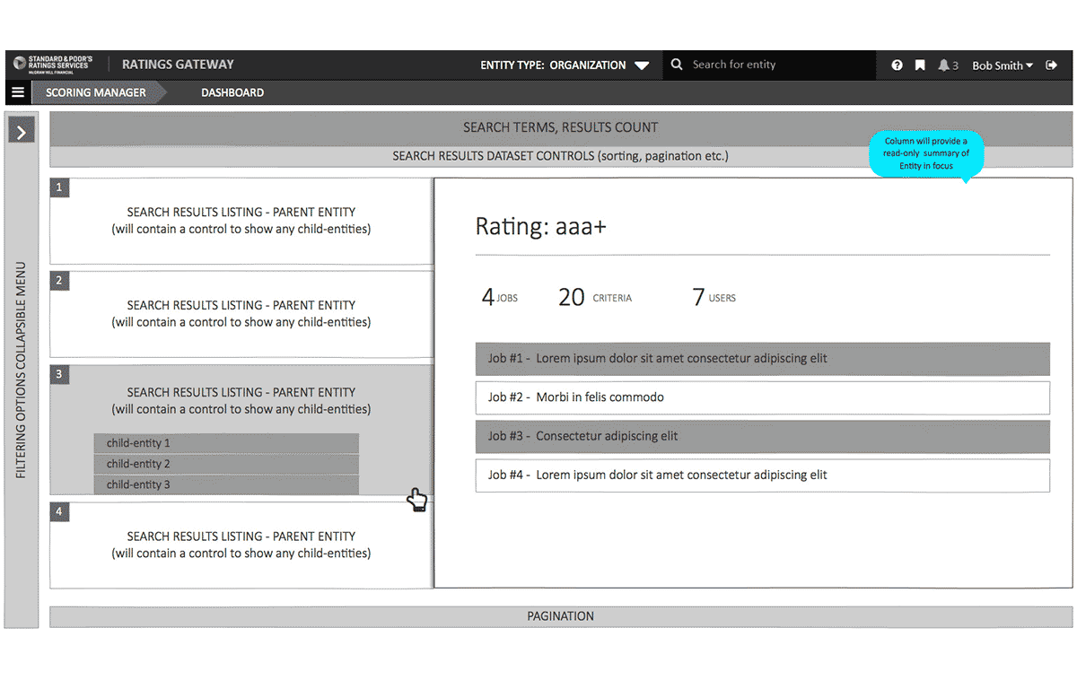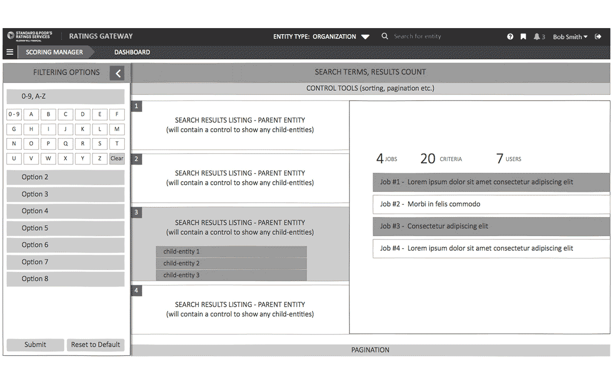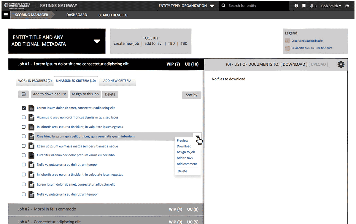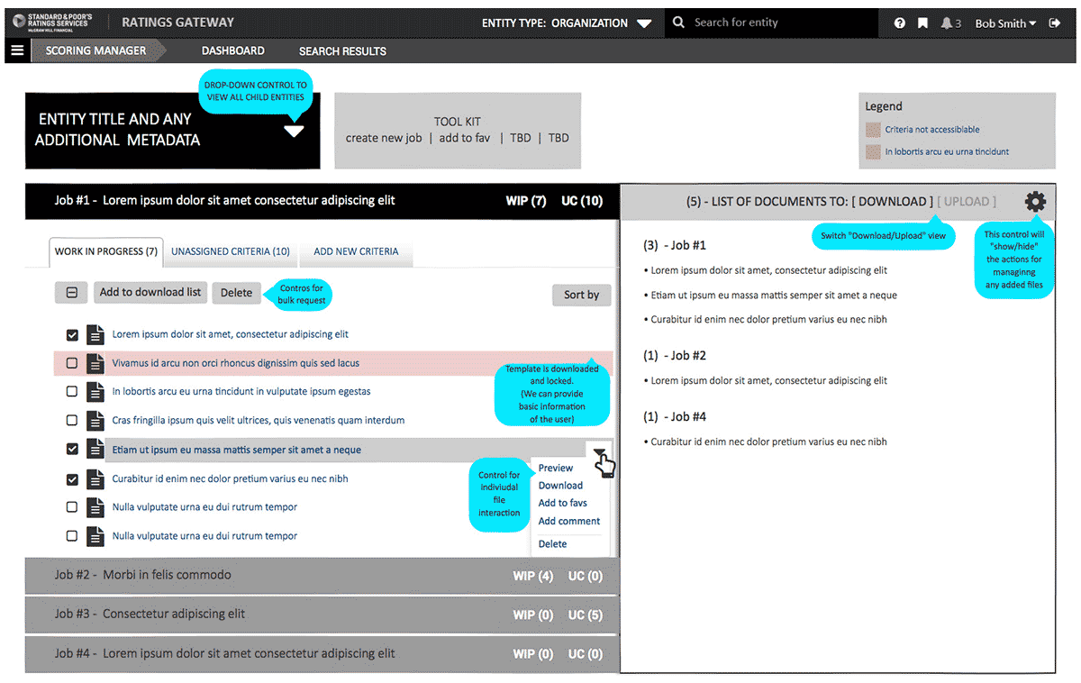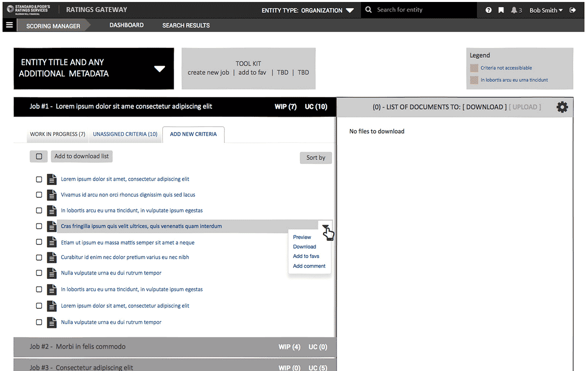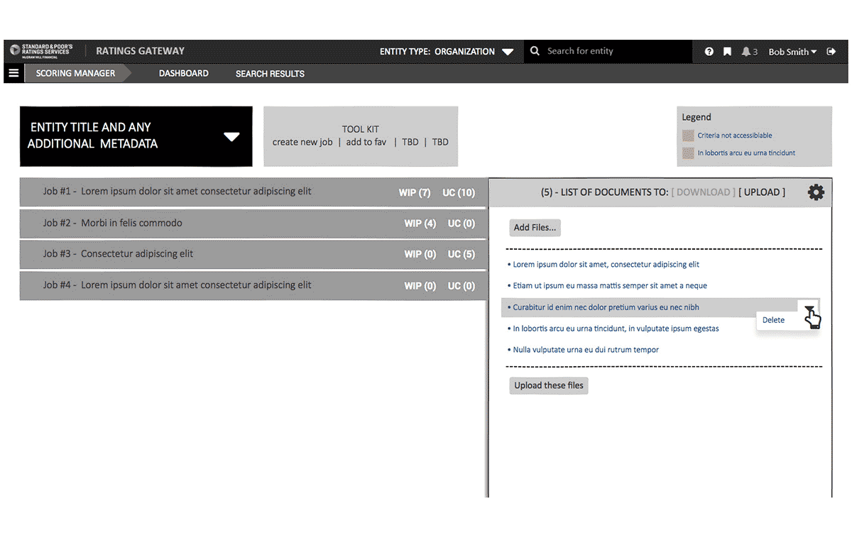 My recommendation was to use as many UX research techniques within scope and budget to communicate covert hurdles. With the many side projects running in tandem at S&P and the development of a new style guide to be use across all new application, it was extremely important that the tool be designed for scalability, and integrate seamlessly.